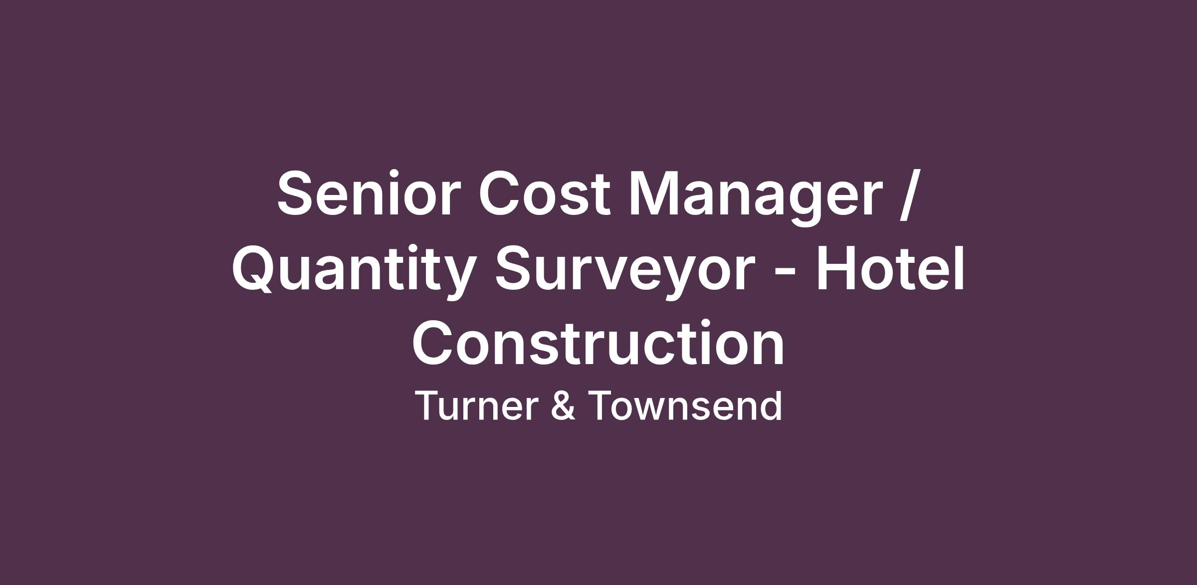 Turner & Townsend are looking for an experienced Senior Cost Manager and/or Quantity Surveyor to act as the key, day to day interface on a client account, ensuring that client objectives are met through the delivery of a value-added cost management service.