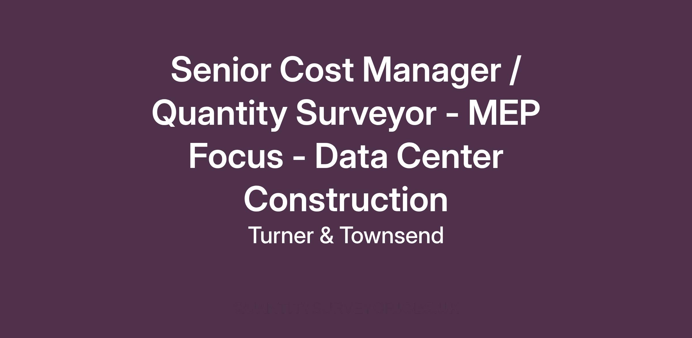 Turner & Townsend are looking for an experienced Senior Cost Manager and/or Cost Manager/Quantity Surveyor with Mechanical, Electrical, and Plumbing (MEP) systems experience to act as the key, day-to-day client interface, ensuring that client objectives are met through the delivery of a value-added cost management service.